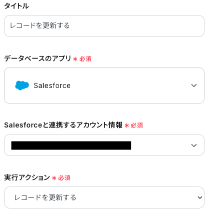 ・データベースを操作するオペレーションで、レコード追加や更新を行う際は、Salesforceの入力形式に沿って設定を行ってください。例えば、Salesforceの入力形式が選択式かつ英語入力の場合、選択肢に存在しない値や異なる言語で入力した値はエラーとなりますのでご注意ください。