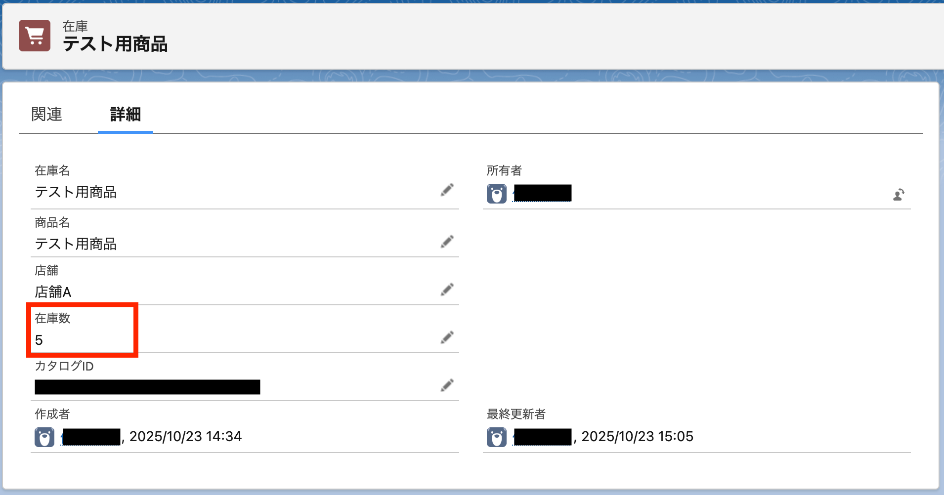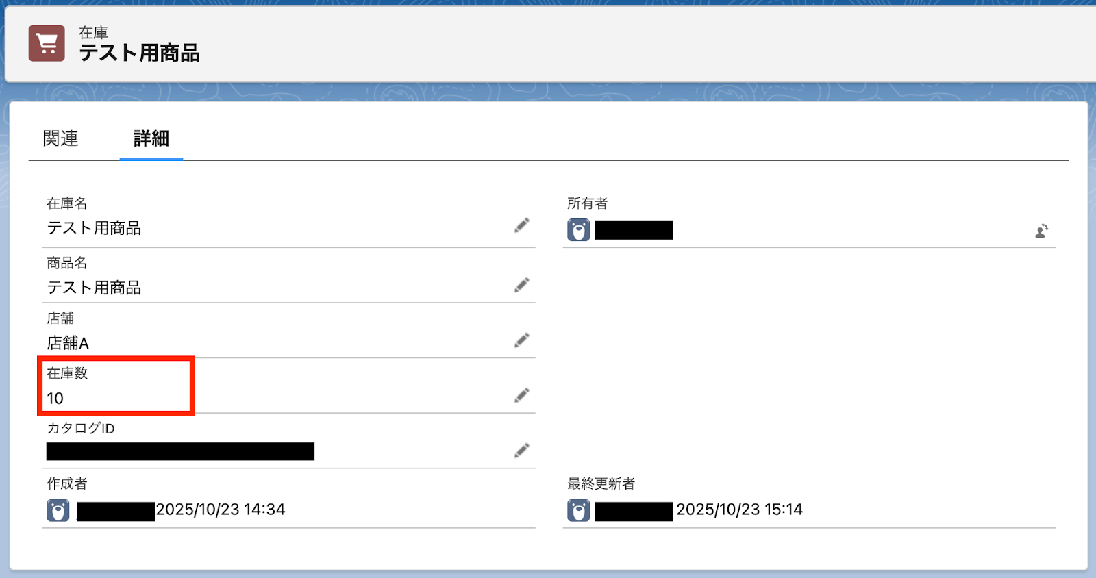 ここでSalesforceで対象のレコードを開き、在庫数が更新されているか確認してみましょう。