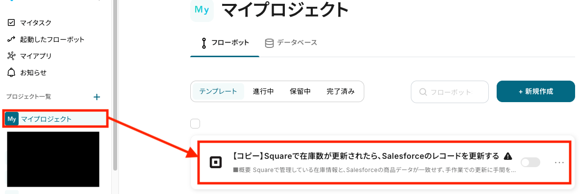 マイプロジェクトから、「【コピー】Squareで在庫数が更新されたら、Salesforceのレコードを更新する」を選んでください。