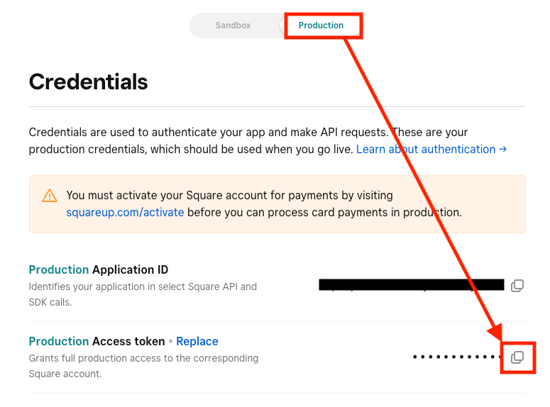 表示された画面で「Production」を選択し、アクセストークンをコピーします。