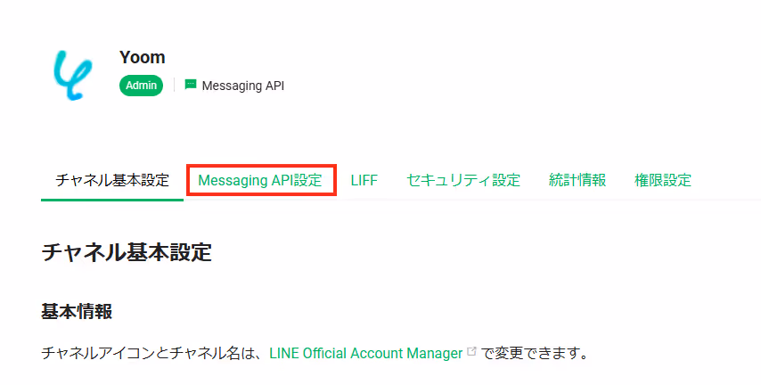 作成したチャネルを選択し、Messaging API設定へ進みます。