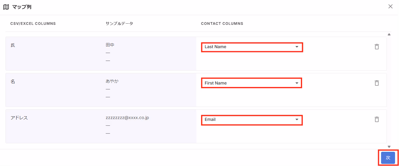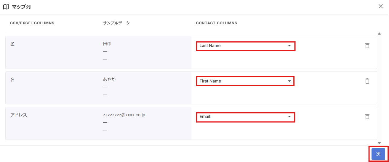 画像のように各項目のマッピング先を選択し、「次」をクリックします。