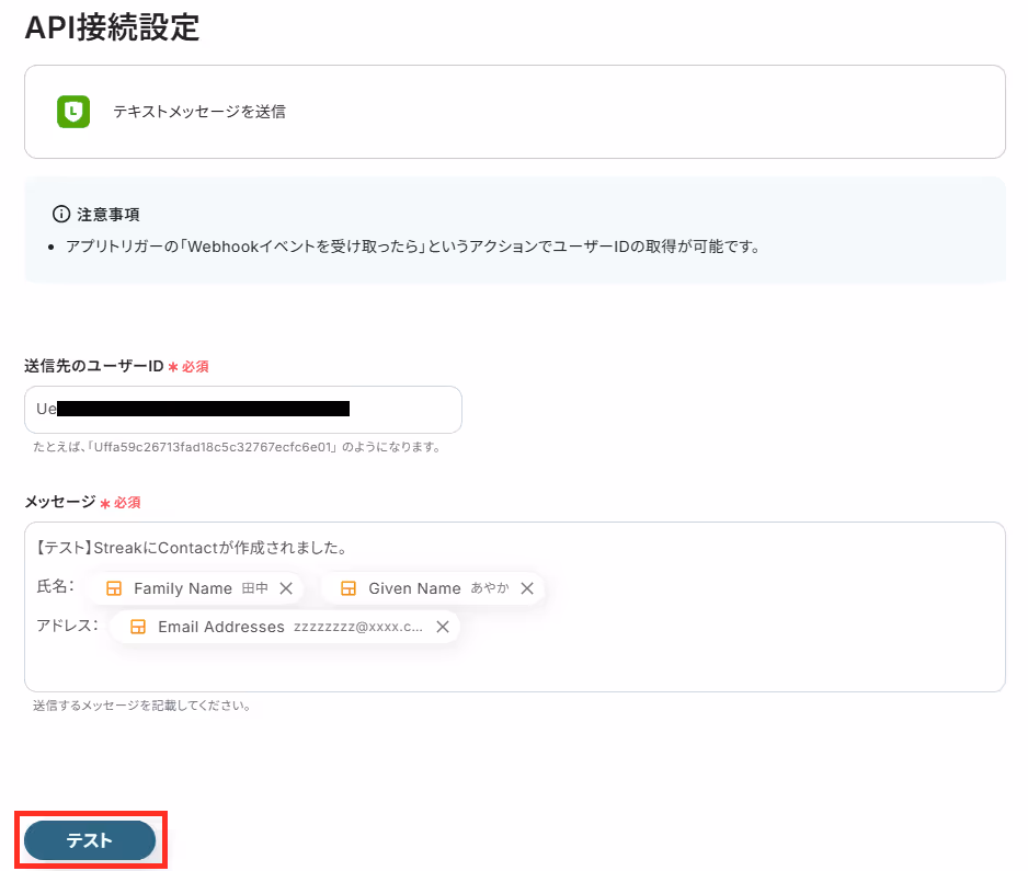 送信先のユーザーID:3.で取得したユーザーIDを入力します