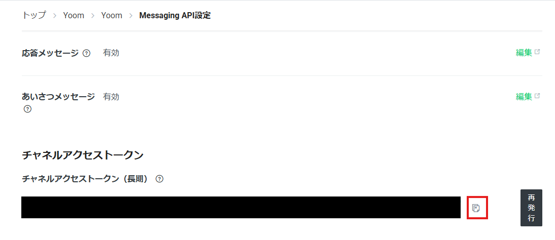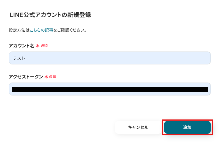 チャネルアクセストークンをYoomの画面で貼り付けし、「追加」をクリックします。