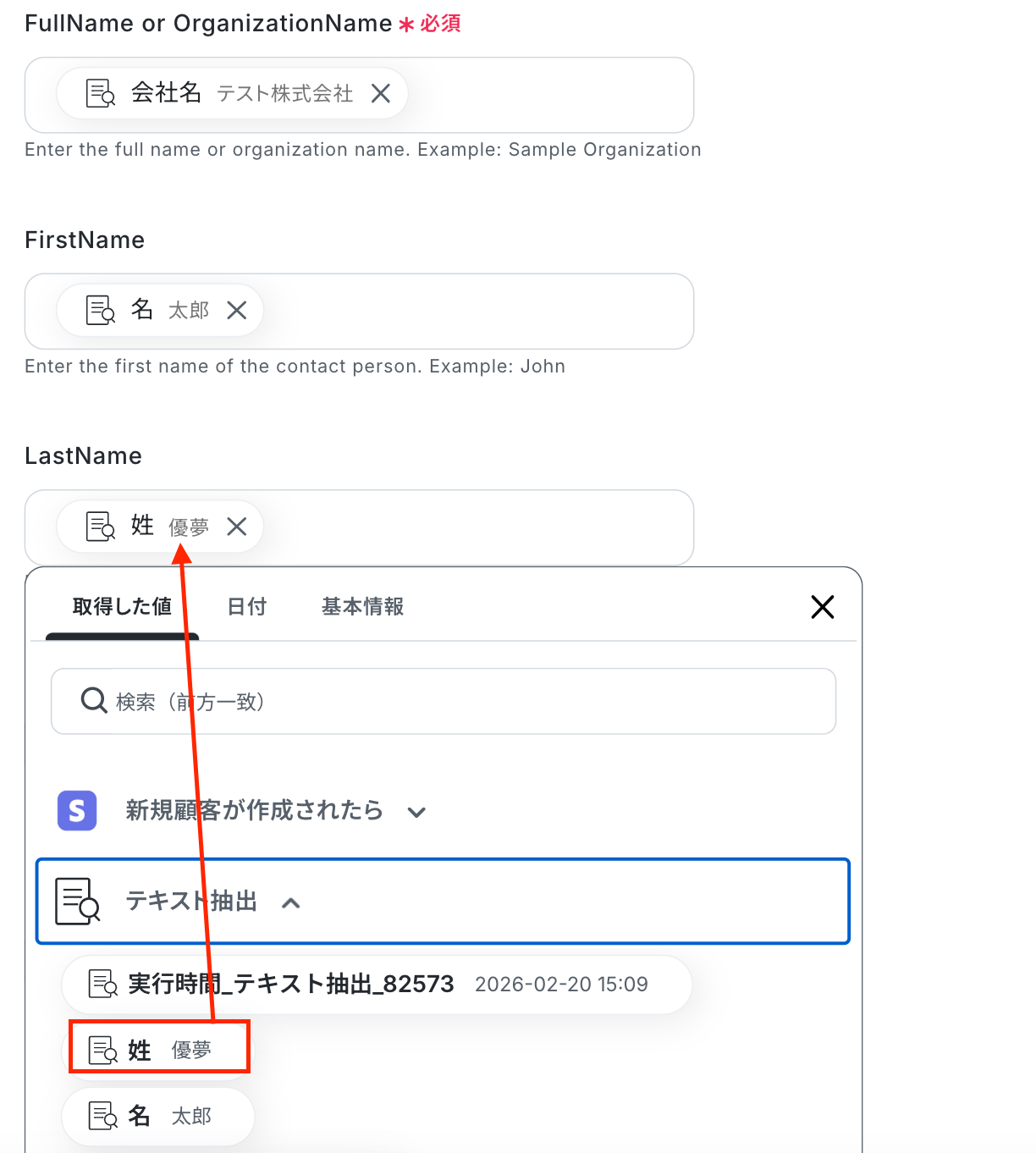 「FullName or OrganizationName」・「FirstName」・「LastName」 は、テキスト抽出の設定で取得した値を引用して設定してください。