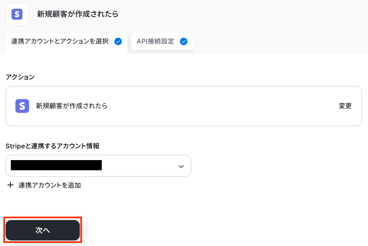 アクションはそのままで、連携するアカウント情報を確認します。 確認後、「次へ」をクリックしましょう!