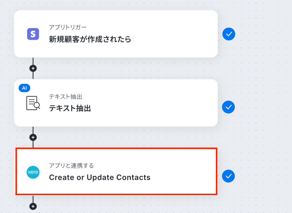 はじめに、StripeとXeroをYoomと連携します 次に、トリガーでStripeを選択し、「新規顧客が作成されたら」というアクションを設定します 次に、オペレーションでテキスト抽出機能を選択し、Stripeから取得した顧客情報からXeroへの登録に必要な氏名やメールアドレスなどを抽出します 最後に、オペレーションでXeroを選択し、「Create or Update Contacts」のアクションで、抽出した情報をもとにContactを作成します ※「トリガー」:フロー起動のきっかけとなるアクション、「オペレーション」:トリガー起動後、フロー内で処理を行うアクション