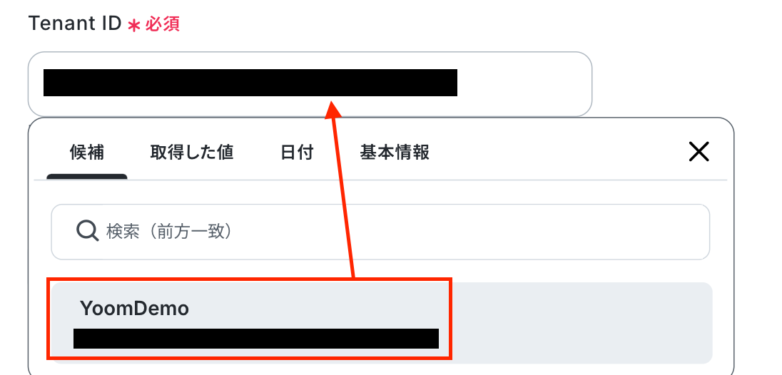 「TenantID」 は、入力欄をクリックして表示される候補から選択します。