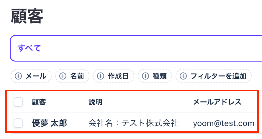 Stripeで新規顧客が作成されたことがトリガーになるため、Stripeの画面に移り、顧客を作成しましょう。 ※「姓」・「名」・「会社名」・「メールアドレス」が設定されていることを前提で解説を進めていきます。