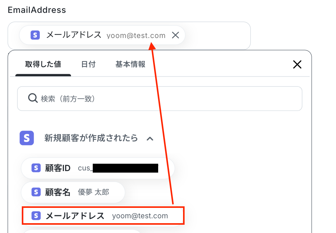「EmailAddress」 は、Stripeの設定で取得した値から選択しましょう。