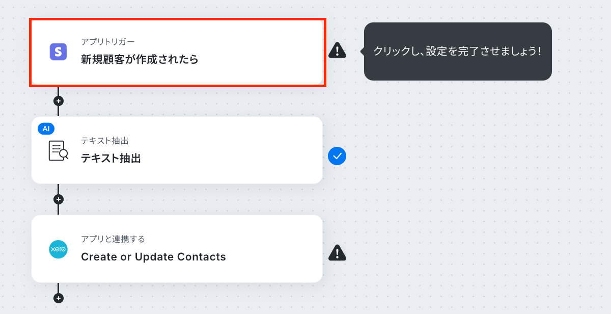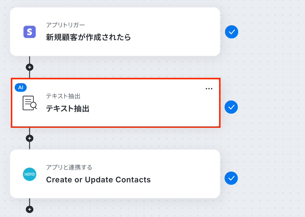 Stripeのトリガー設定、テキスト抽出設定、Xeroのアクション設定