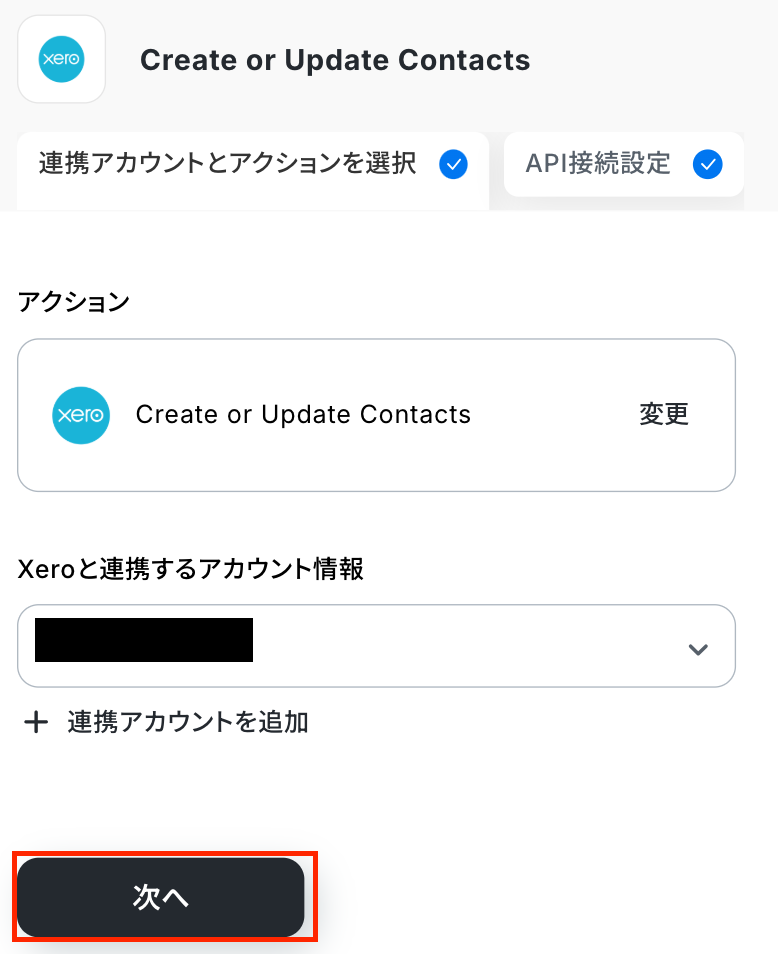 ステップ5:Xeroのアクション設定 最後の設定です!ここでは、XeroにContactを作成する設定を行います。 赤枠をクリックしましょう!
