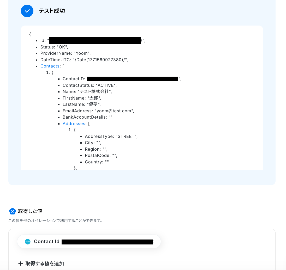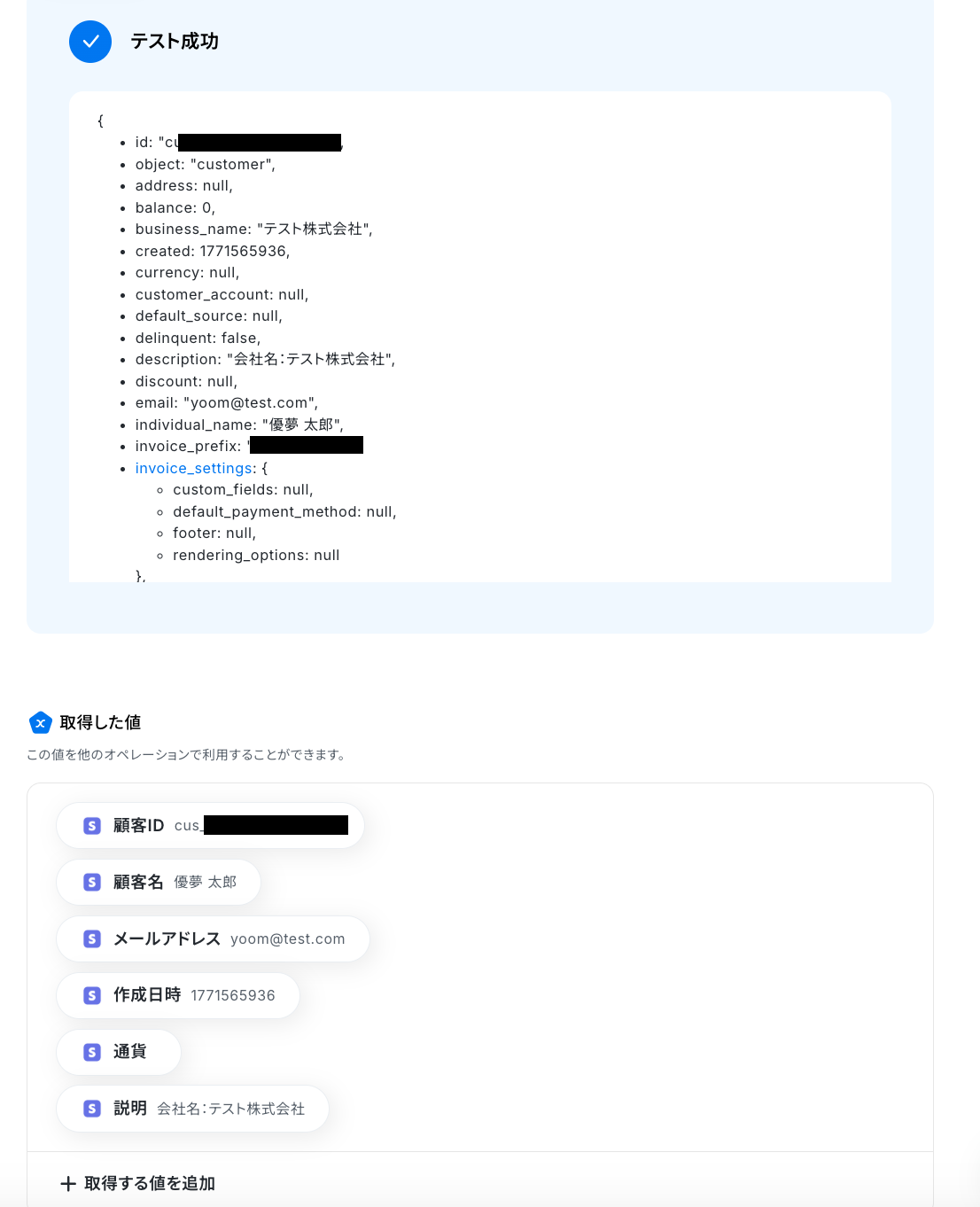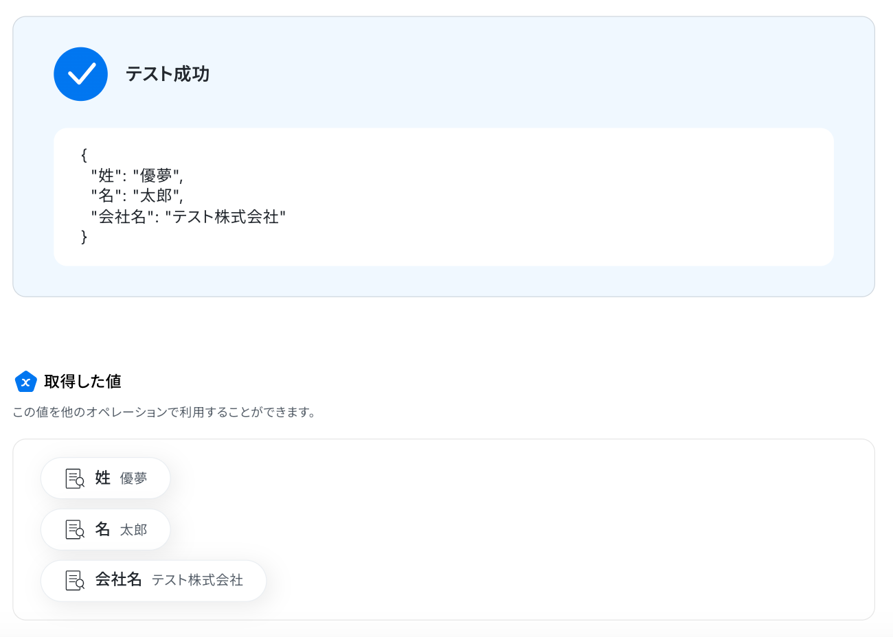 テストをクリックしましょう! テストに成功すると、取得した値が表示されます。※ 取得した値 とは? トリガーやオペレーション設定時に、「テスト」を実行して取得した値のことを指します。 後続のオペレーション設定時の値として利用でき、フローボットを起動する度に変動した値となります。