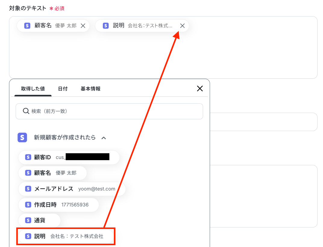 詳細設定の画面に遷移したら、「対象のテキスト」 を設定します。 以下の画像のように、Stripeのオペレーションで取得した値を設定してください。 取得した値は入力欄をクリックすると表示されます。