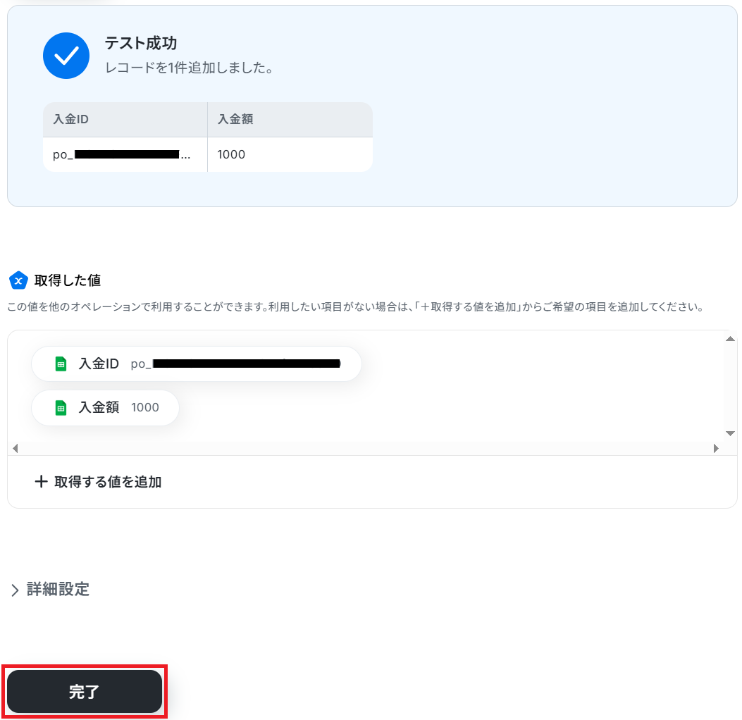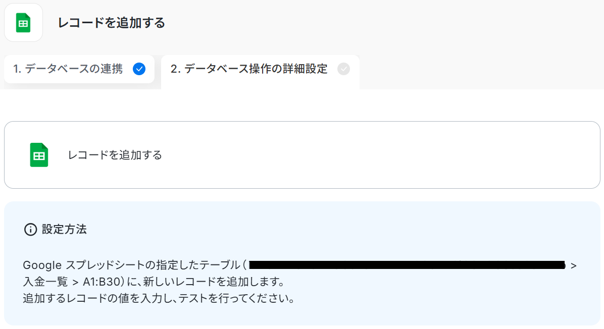 先ほど取得した入金情報を、Google スプレッドシートに自動で記録する設定をします。