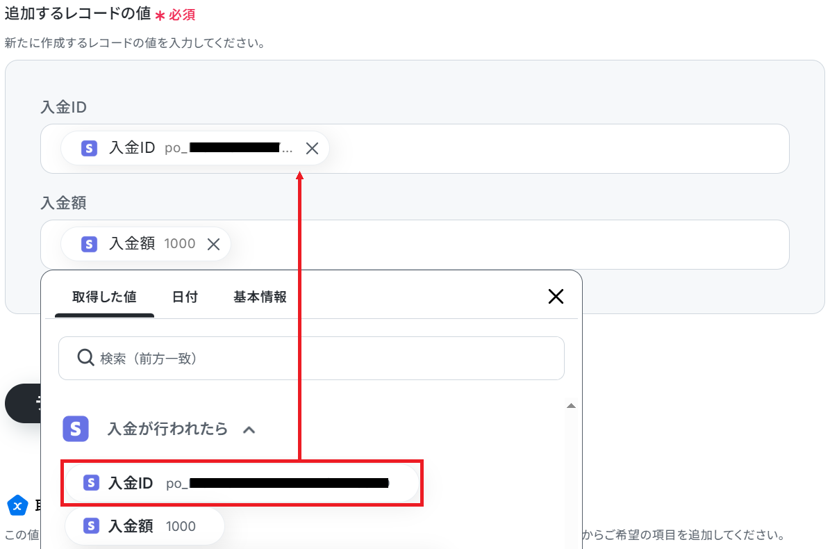 - Google スプレッドシートにレコードを追加する際、Stripeのトリガーから取得した入金日、金額、顧客情報などの値を、どの列に記録するかを任意で設定できます。