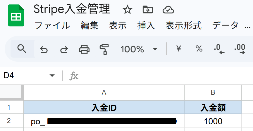 用意したシートに、Stripeの入金情報が自動で記録されました!