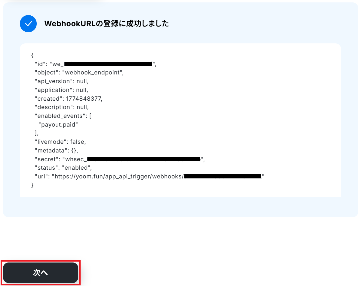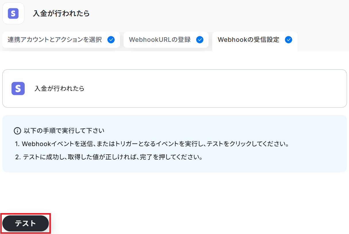 最後に、Yoomの設定画面に戻りテストしましょう。