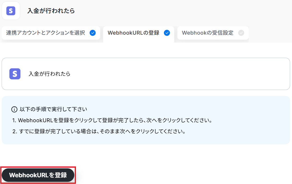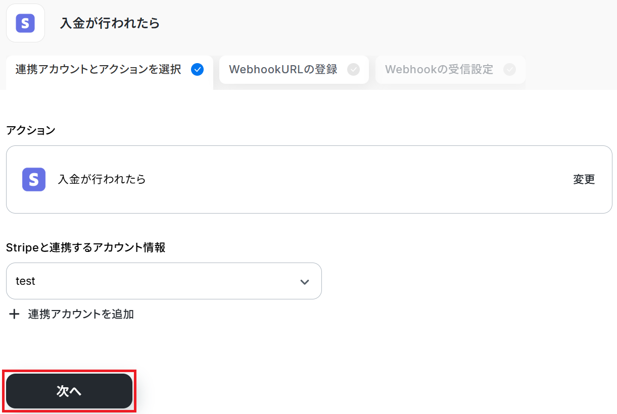タイトルと連携するアカウント情報を任意で設定し、アクションはテンプレート通りに「入金が行われたら」のまま「次へ」をクリックします。