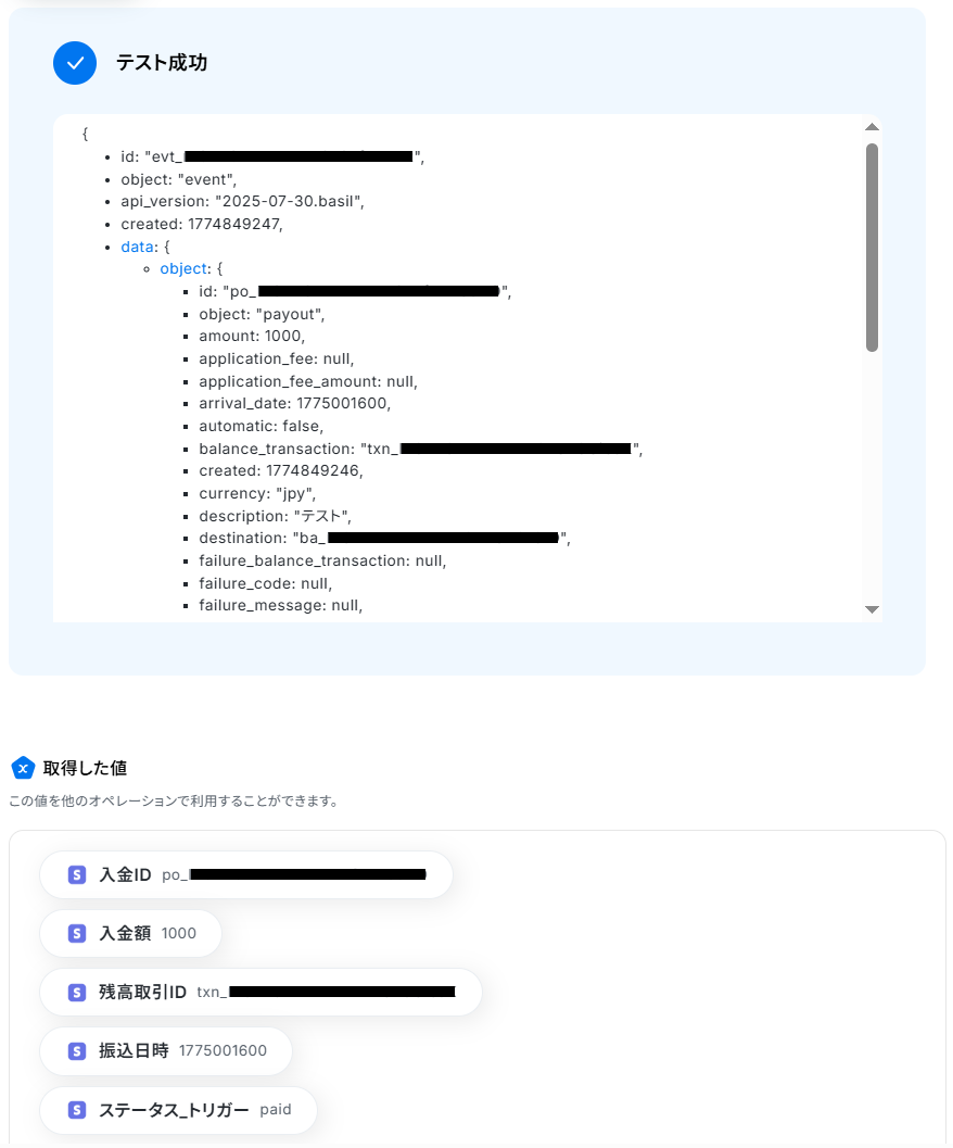 以下のようにStripeから取得した値を選択すると、トリガーが実行されるたびに最新の入金情報を反映できます。全ての項目を埋めたらテストしましょう。