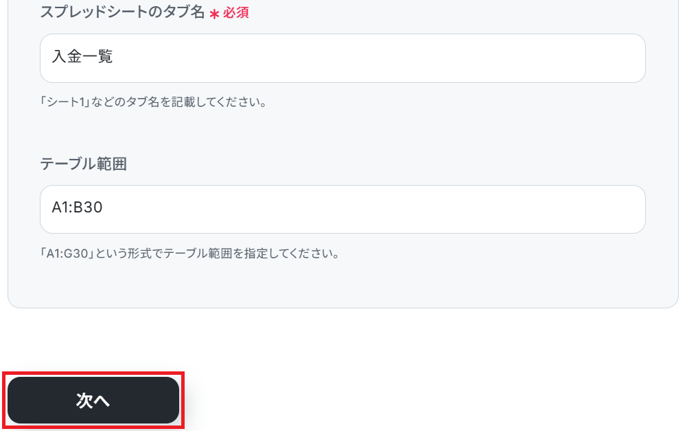 同様にスプレッドシートのタブ名も選択し、任意でテーブル範囲を入力して「次へ」をクリックします。