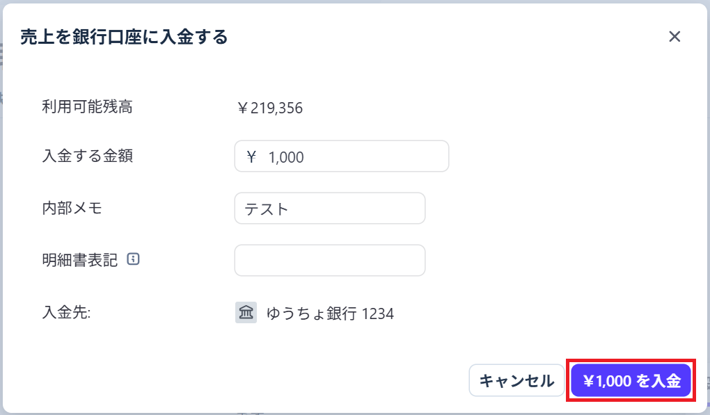 ここまできたら一旦Stripeに移り、テスト用に入金してください。