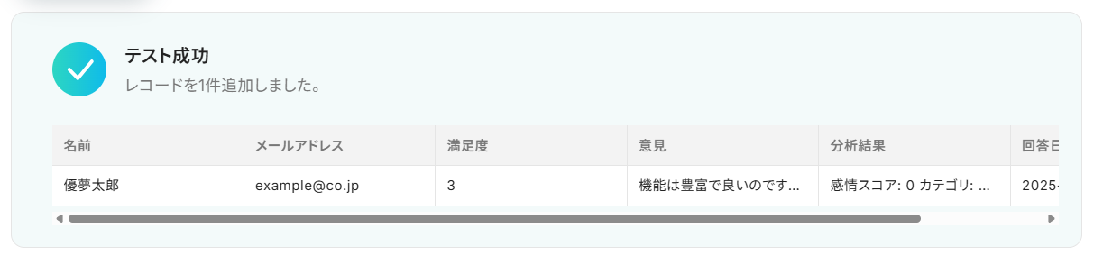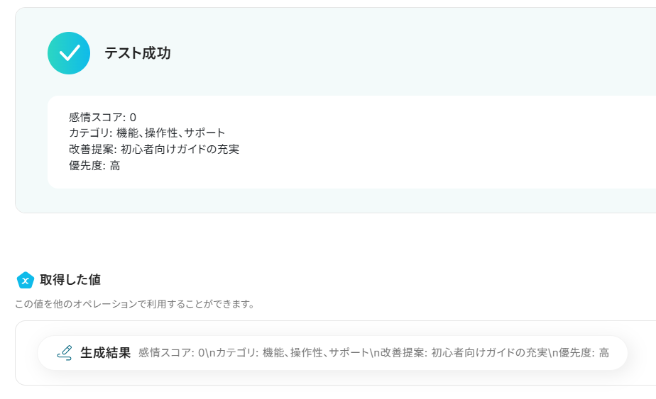 この連携はAIによるデータ加工処理を含むため、アンケートの自由回答欄の分析や顧客からのフィードバックの整理といった業務を効率化し、手作業では得られなかったインサイトの発見をサポートします。