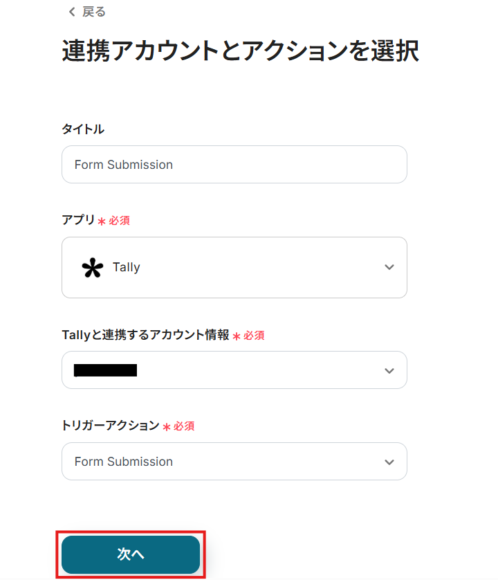 連携するアカウント情報には、ステップ1で連携したアカウント情報が反映されています。トリガーアクションはそのままにして、「次へ」をクリックしてください。