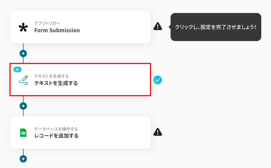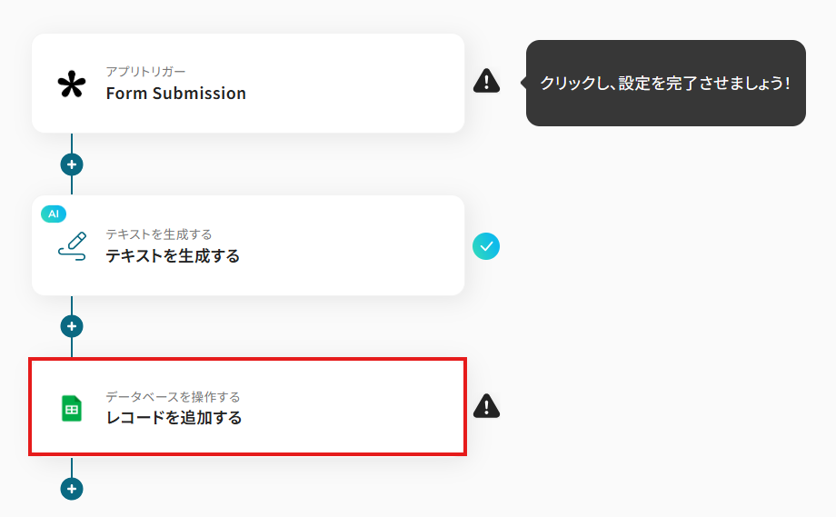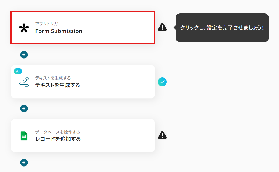 このワークフローを活用すれば、Tallyでフォームが送信されると、AIが自動で回答内容を分析し、その結果をGoogle スプレッドシートに自動で追加するため、一連の作業を効率化できます。