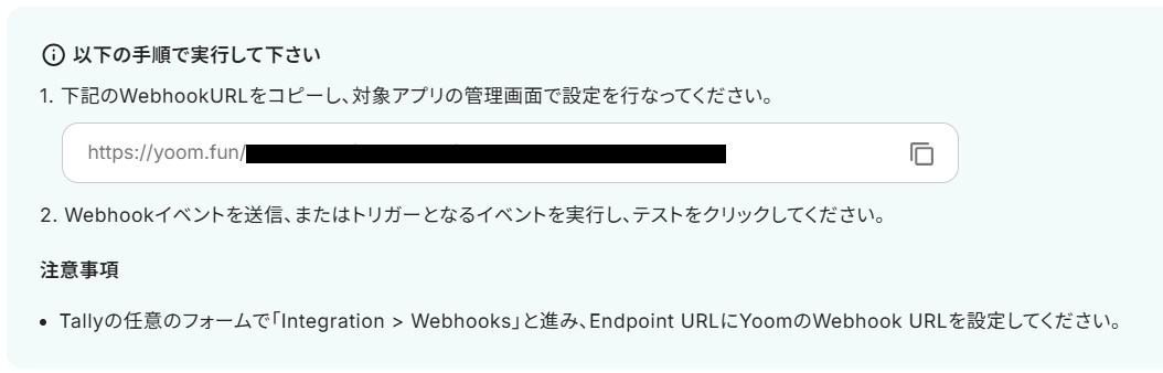 URLをコピーしたら、Tallyの画面で設定を行います。