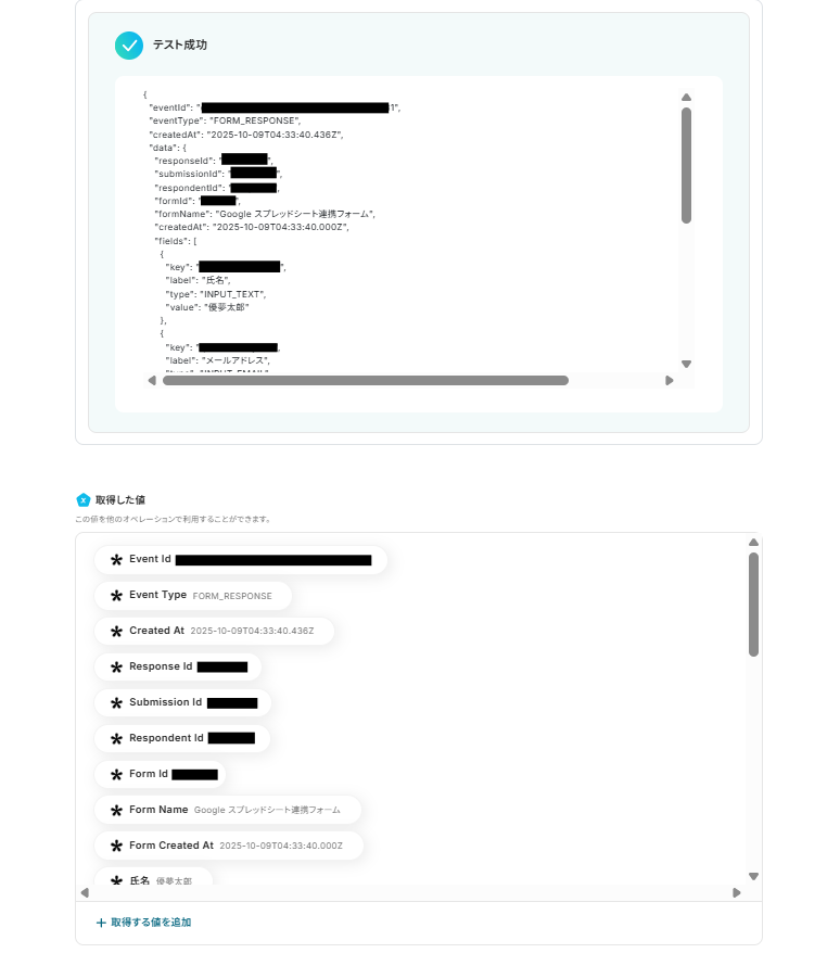 トリガーやオペレーション設定時に、「テスト」を実行して取得した値です。