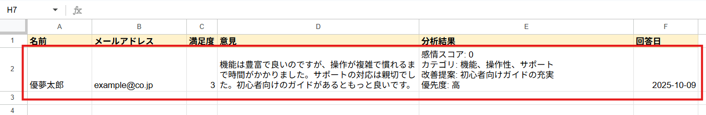 実際にGoogle スプレッドシートにデータが追加されることを確認してください。確認後、保存しましょう。