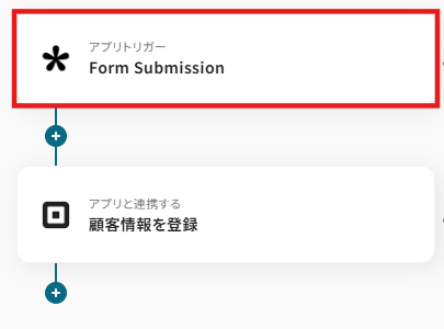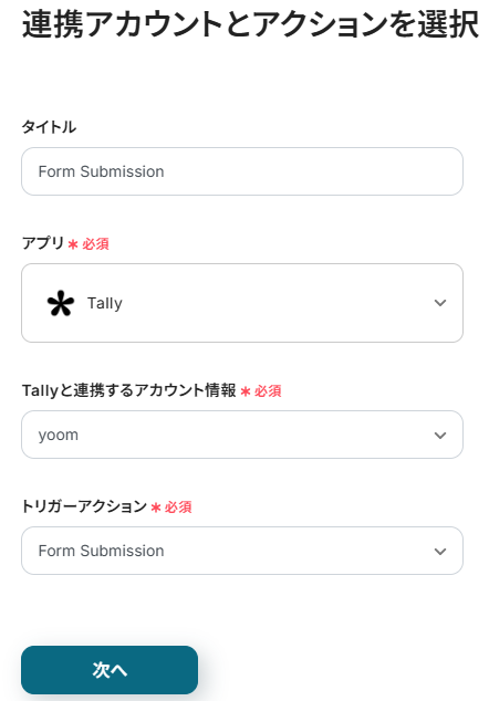 タイトルと連携するアカウント情報を任意で設定し、トリガーアクションはテンプレート通りに「Form Submission」のまま「次へ」をクリックして進んでください。