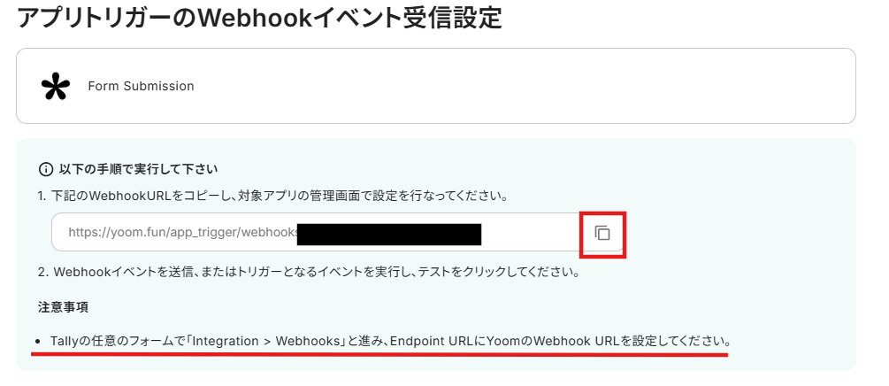 3.画面が切り替わったら、WebhookURLをコピーしてTallyの管理画面で設定します。