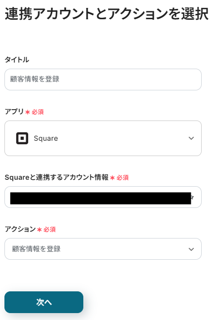 先ほどと同様にタイトルと連携するアカウント情報を任意で設定し、アクションはテンプレート通りに「顧客情報を登録」のまま下にスクロールしましょう。
