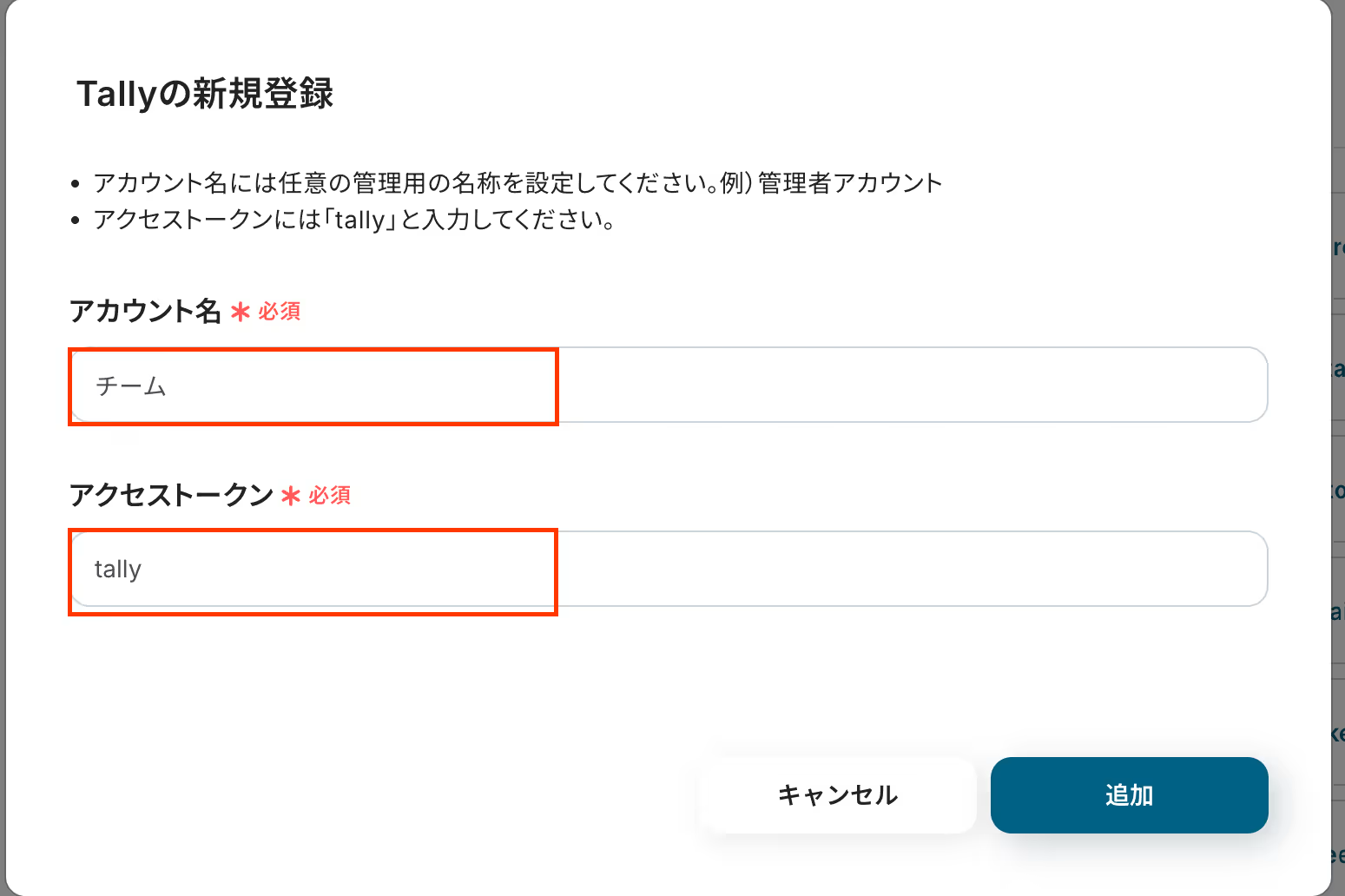 ・アクセストークンは「tally」と入力し、追加をクリックしてください。