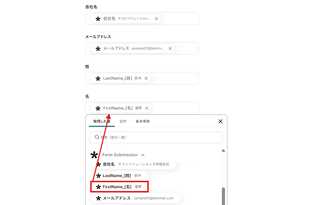 今回はテスト用のフォームで回答した会社名、姓、名、メールアドレスを設定しています。