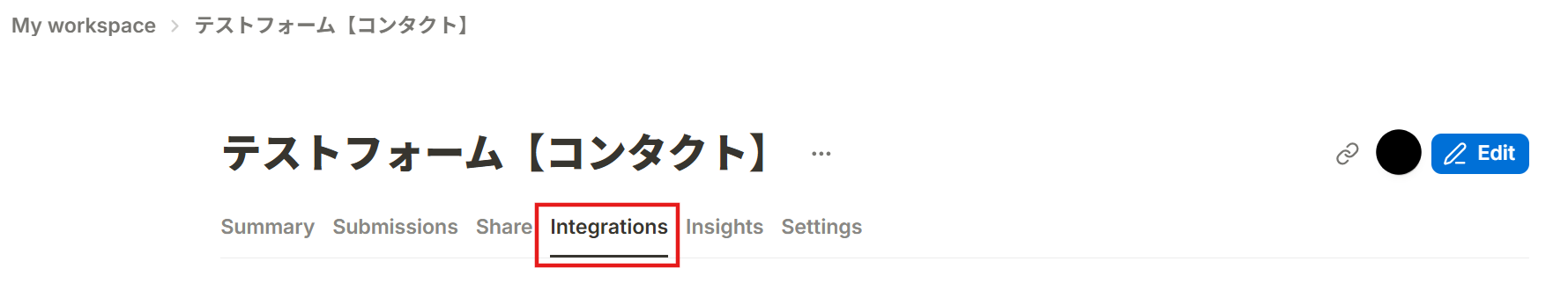 先ほど作成したフォームを選択してIntegrationsをクリックし、Webhookの設定を行いましょう。