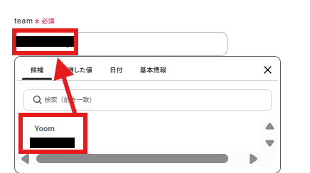 「team、space、folder、list_id」は以下のように全て候補から選択してください。
