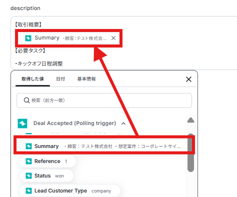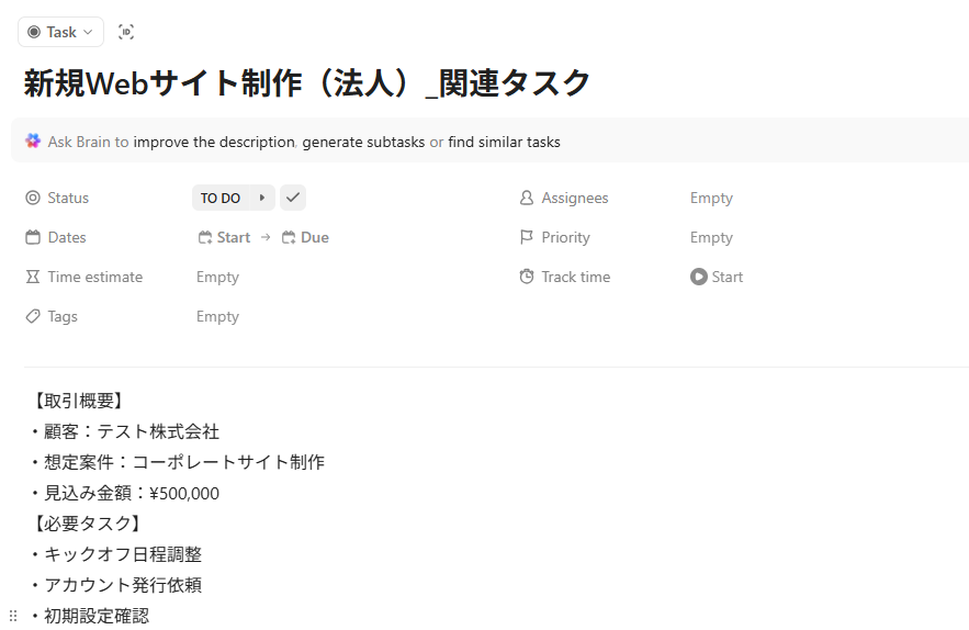 - ClickUpで作成するタスクのタイトルや説明欄に、Teamleaderから取得したDeal情報や関連タスクの内容を設定してください