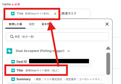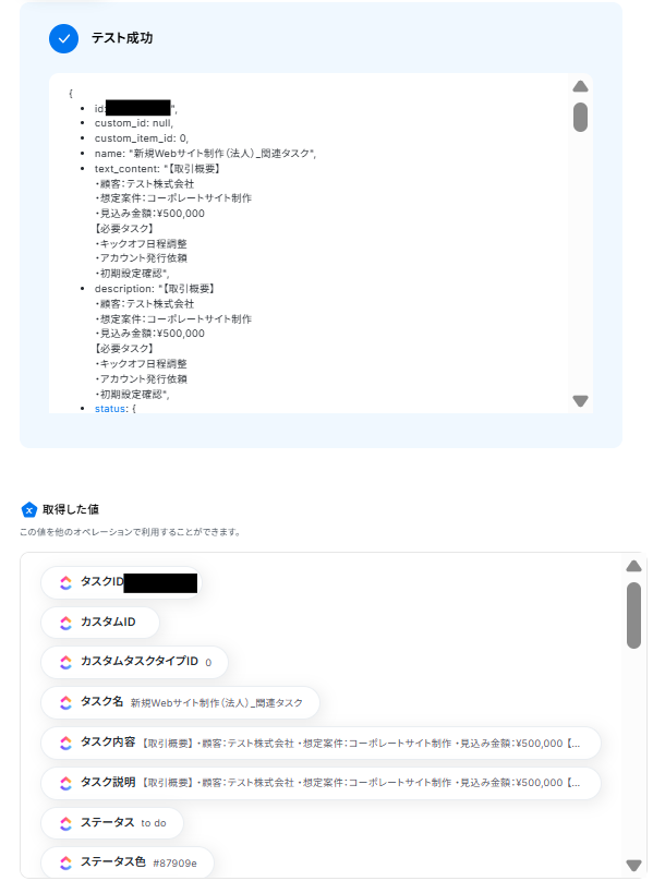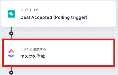 - 最後に、オペレーションでClickUpの「タスクを作成する」アクションを設定し、トリガーで取得したDeal情報を基に関連タスクを作成します