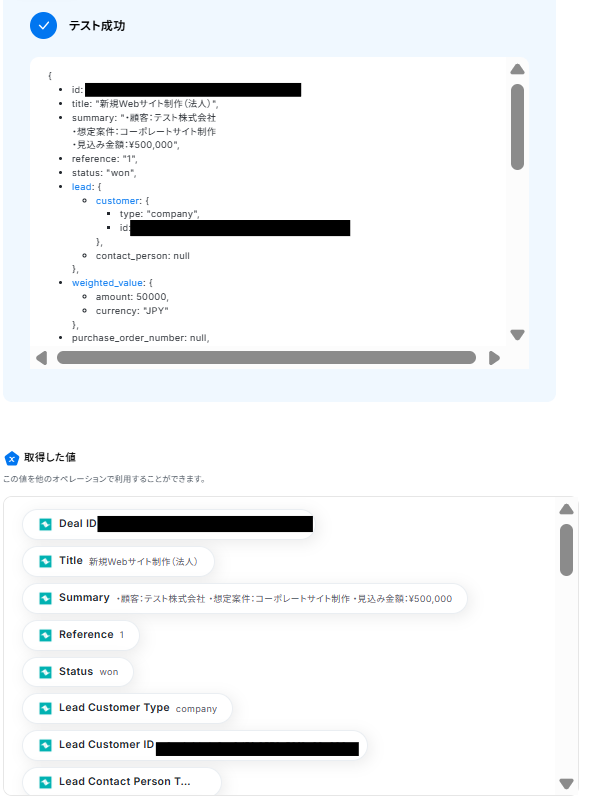- 次に、トリガーでTeamleaderを選択し、「新しいDealが作成されたら」というアクションを設定して取引IDなどの情報を取得します