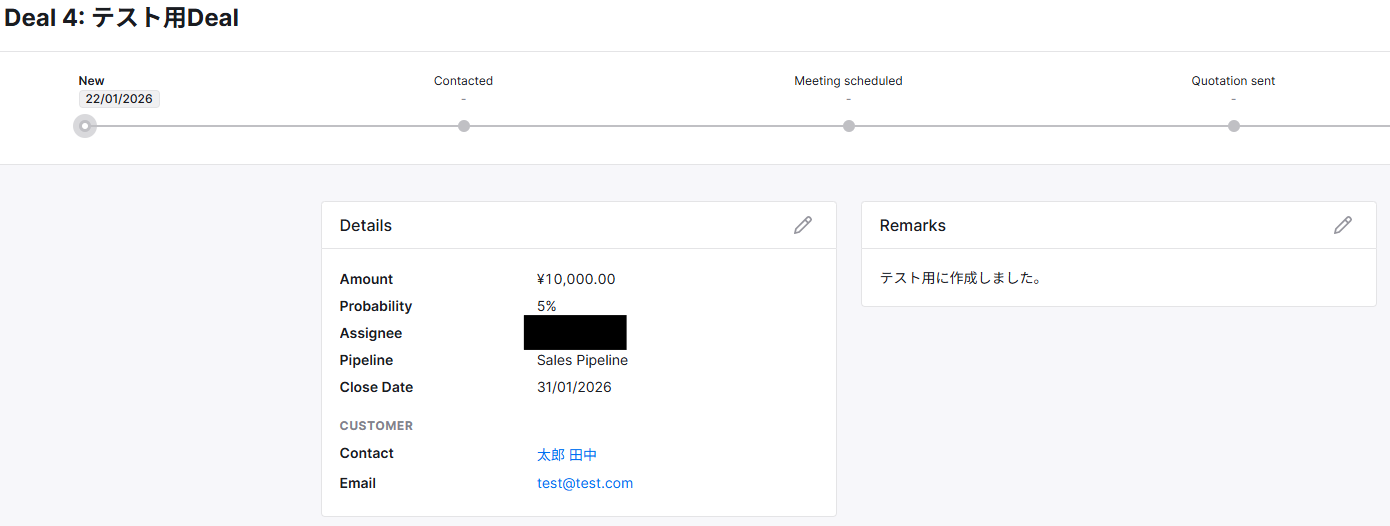 Teamleaderにテスト用のDealを作成しましょう。