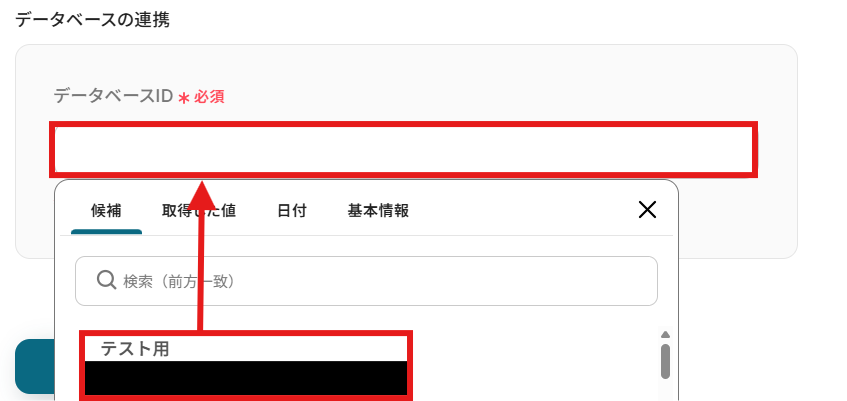 「NotionのデータベースID」を候補から選択しましょう。