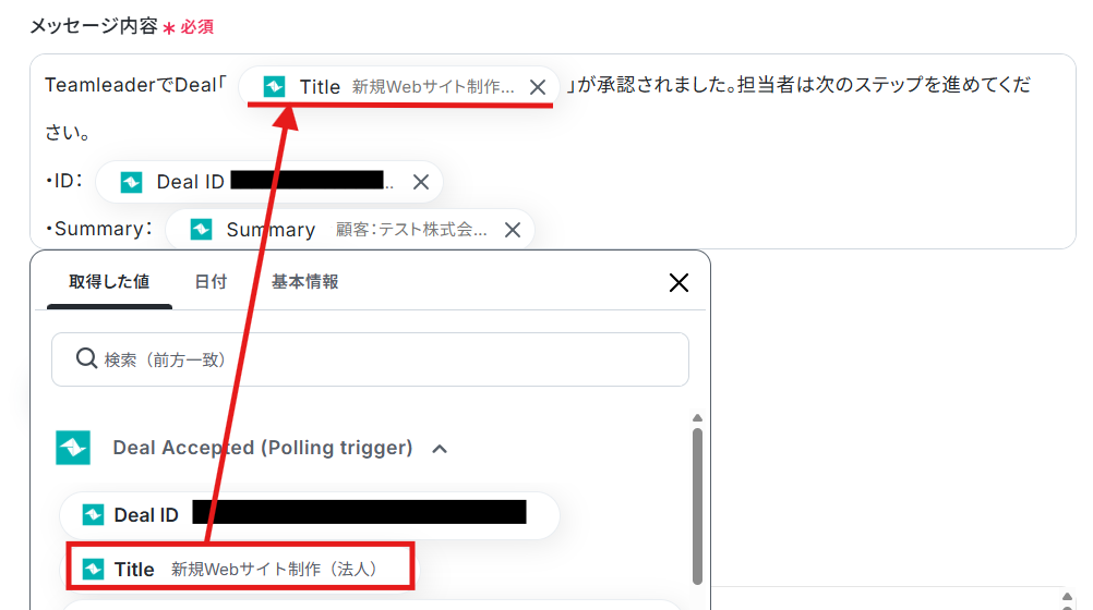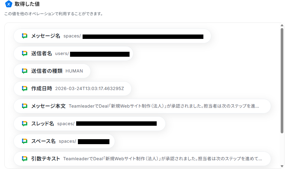 メッセージの内容は初期設定されています。 デフォルトの設定をそのまま使う場合は、Teamleaderで承認したDealの「Title」「Deal ID」「Summary」「Status」が自動で引用され、Google Chatにメッセージとして送信可能です。 メッセージ内容は自由に編集できますので、用途に応じて文章や取得した値を調整して設定してください。【Tips】 取得した値はフローボットを起動する度に変動する値として扱われます。 テキストを直接入力した部分は固定値として処理されるため、毎回変動する情報{{Title}}などは、取得した値を活用しましょう!