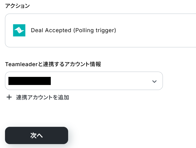 Teamleaderと連携するアカウント情報を確認したら、「次へ」ボタンをクリックしましょう。