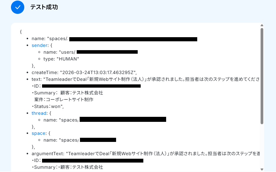 「TeamleaderでDealが承認されたらGoogle Chatに通知する」 フローの完成です!