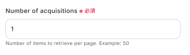 Number of acquisitionsは、1ページあたりに取得するアイテム数を指定します。 今回は例として、1と設定しました。