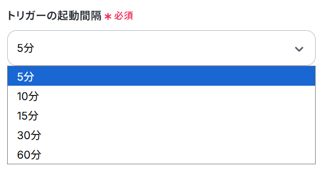 トリガーの起動タイミングは、5分、10分、15分、30分、60分のいずれかで設定できます。ご利用プラン によって、設定できるトリガーの最短間隔が違うので、その点は要チェックです。 なお、基本的にはそのプランの最短の起動間隔にしてお使いいただくことをおすすめします。
