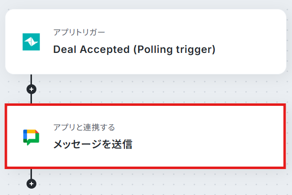 次に、Teamleaderで承認したDealの情報を引用し、Google Chatにメッセージを自動送信する設定を行いましょう。 「メッセージを送信」という項目をクリックしてください。
